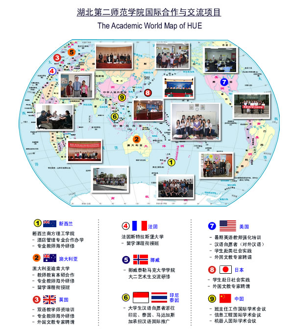 HUE establishes close ties with over 20 overseas universities, colleges and scientific research institutions from the United States, Great Britain, Australia, New Zealand, Japan, Kazakhstan and other countries and regions. The University has been accredited with three international joint education programs by Ministry of Education, namely, Electronic Information Science and Technology, Computer Science and Technology, Pre-School Education. It is designated by Hubei Provincial Education Department to dispatch international volunteer Chinese teachers to overseas. Many students are selected to go abroad to carry forward Chinese language teaching cause every year. In the meanwhile, there are various kinds of student exchange programs ready for students to enlarge their international vision.