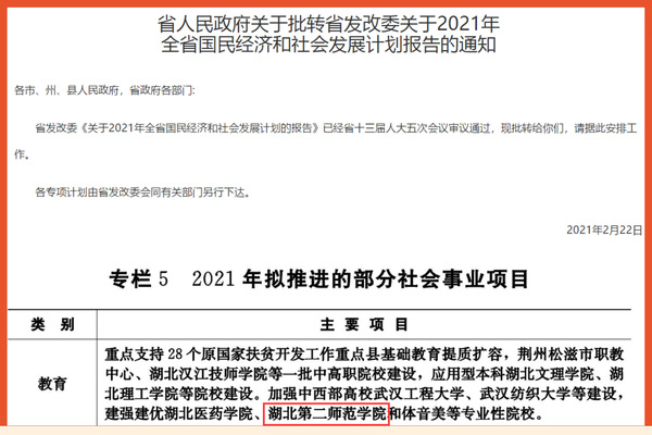 本网讯 近日,湖北省人民政府发布了《关于批转省发改委关于2021年全省国民经济和社会发展计划报告的通知》,通知公布了湖北省2021年九个方面重点工作,其中专栏5《2021年拟推进的部分社会事业项目》中明确提出了要建强建优BEAT365英国官网等专业性院校。