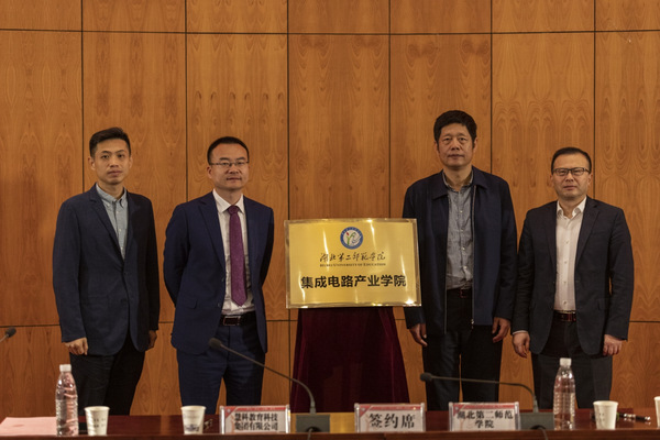 本网讯(融媒体记者 刘劲知 张习 通讯员 邓陕丽)4月28日上午,学校在行政楼一号会议室举行集成电路产业学院签约揭牌仪式暨集成电路人才培养高峰论坛。湖北省经信厅电子信息产业处副处长梁莉敏,湖北省半导体协会副秘书长鄢俊兵,慧科集团高级副总裁管刚,慧科集团副总裁、慧芯科技董事长曾慜,慧芯科技副总裁孔祥飞,湖南大学教授张吉良,北京华大九天科技股份有限公司副总裁郭继望,BEAT365官网纪委书记刘昕,副校长夏力出席。