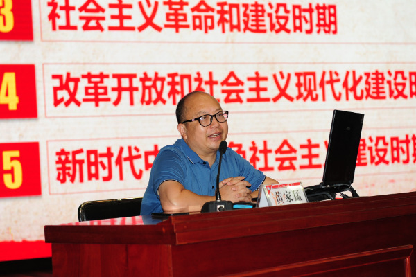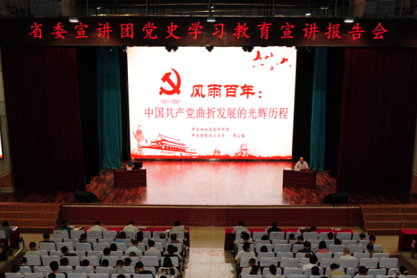 黄家猛教授从学术角度,用辩证思维,以《风雨百年:中国共产党曲折发展的光辉历程》为题,深入浅出,旁征博引地从“中国共产党历史发展脉络”、“新民主主义革命时期”、“社会主义革命和初步建设时期”、“改革开放和社会主义现代化建设时期”、“新时代中国特色社会主义建设时期”五个层面,梳理了中国共产党的百年发展历程,深刻阐述了中国共产党发展的光辉历程,并重点就“新民主主义革命时期”中国共产党曲折发展的数次历史重要节点开展讲述,同时阐述了湖北在中国共产党发展历史中的重要方位。