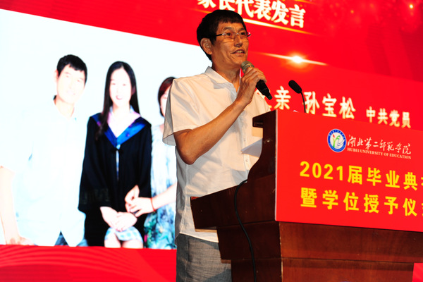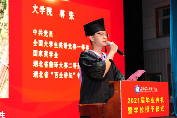 优秀毕业生代表、2017级汉语言文学2班蒋张同学发言,他回忆了大学四年的点点滴滴,表达了对母校的感激之情和美好的祝愿。家长代表孙宝松发言,他回忆了第一次到武汉送女儿报道的场景;感慨见证女儿成长的同时也见证了学校的巨大变化和发展;感谢学校对女儿的精心培养。