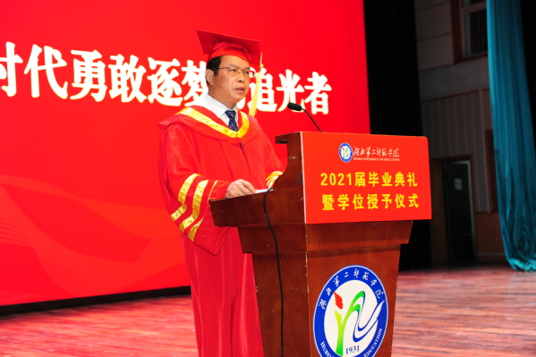 郑军校长代表学校向全体毕业生表示祝贺。他介绍了部分2021届毕业生所取得的成绩并寄语大家:一要志存高远,砥砺奋进,永葆自强不息的青春底色;二要遵纪守法,崇德向善,坚守厚德载物的做人底线;三要博闻强识,含英咀华,厚植温润如玉的文化底蕴;四要诚实劳动,求是拓新,涵养攻坚克难的奋斗底气。