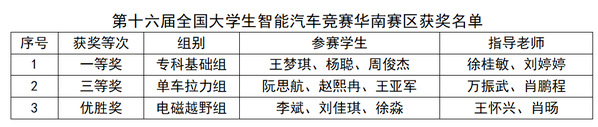 经过激烈的比拼,由王梦琪、杨聪、周俊杰三位同学组成的参赛团队在“专科基础组”竞赛中以华南赛区第一名的优异成绩斩获一等奖并入围八月中旬的全国总决赛;阮思航、赵熙冉、王亚军三位同学组成的参赛团队在“单车拉力组”竞赛中获三等奖;李斌、刘佳琪、徐淼三位同学组成的参赛团队在“电磁越野组”竞赛中获得优胜奖。