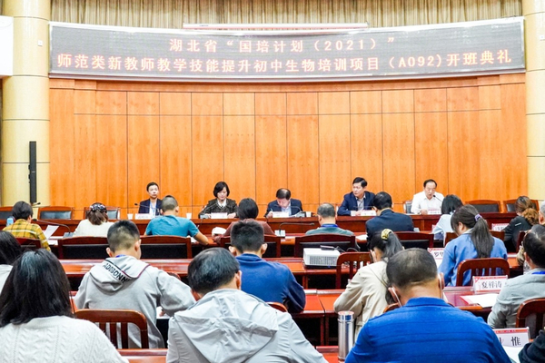 本网讯(通讯员 任春红)10月9日上午,湖北省“国培计划(2021)”师范类新教师教学技能提升初中生物培训项目(A092)开班典礼在BEAT365官网行政楼一号会议室举行。副校长胡兴、湖北省普通教育干部培训中心常务副主任王勇出席,化学与生命科学学院分党委书记严莉萍主持。