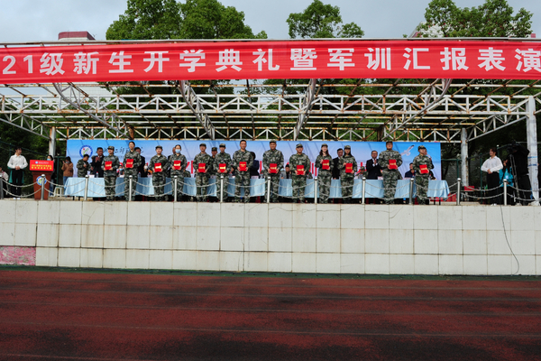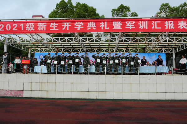 汇报表演结束后,工作人员宣读了《关于表彰2021年军训先进集体和先进个人的决定》,校领导为获奖集体及个人颁奖。