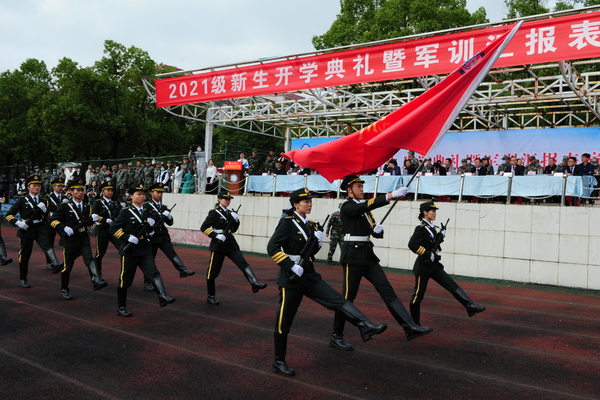 开学典礼在庄严的国歌声中拉开序幕。张国秀书记下达军训汇报表演开始的指令,2021级新生各军训方阵迈着矫健有力的步伐,喊着激情澎湃的口号,依次通过主席台,接受检阅。