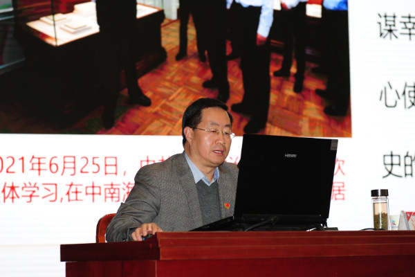 梁伟军作了题为《以史为鉴守初心,继往开来践使命——学习贯彻落实党的十九届六中全会精神》的专题辅导报告。报告围绕党的十九届六中全会基本情况、准确把握全会精神的精髓要义和深入学习贯彻落实全会精神三个部分,从党的百年奋斗主题主线和主流本质、党的百年奋斗重大成就和历史经验的重大意义、新时代取得的历史性成就、发生的历史性变革、马克思主义中国化的三次飞跃、“两个确立”、党的百年奋斗五大历史意义、党的百年奋斗十大历史经验,以史为鉴、开创未来的重要求,从党的百年奋斗中汲取智慧和力量等十个方面对全会精神的精髓要义进行了详细全面解读。他表示,深入学习贯彻落实全会精神,要坚持唯物史观和正确党史观,要把思想和行动统一到党中央决策部署上来,要把学习成果转化为工作动力和惠民实效。