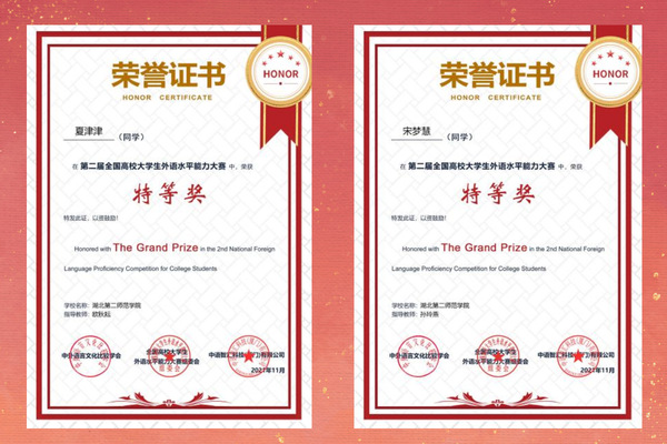本次大赛按照大学英语六级考试的试卷结构出题,来自全国160余所院校的4万多名学生参赛,5000人进入决赛,经过激烈的角逐,外国语学院2019级商英本科2班宋梦慧和2020级商英本科2班夏津津斩获特等奖;2019级商英本科1班刘裕雯斩获一等奖;2019级商英本科1班袁昭,2019级商英本科2班刘淩泷、杨丽雯,2020级商英本科1班樊俊晨,2020级商英本科2班易彦希斩获三等奖。
