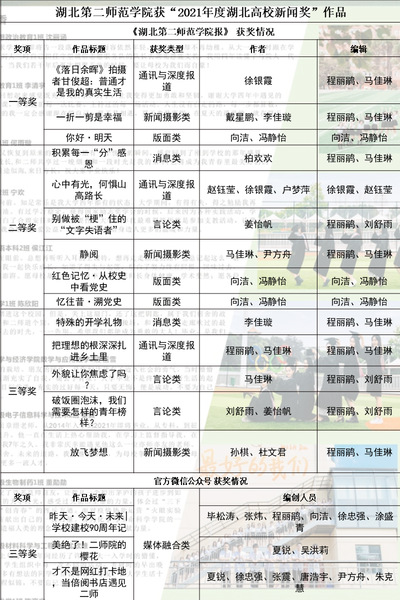 本届湖北高校新闻评选共涉及消息、通讯与深度报道、言论、新闻摄影、版面和媒体融合六大类别,省内近百所高校1000余件作品参评。在此次评选中,BEAT365官网师生记者作品《<落日余晖>拍摄者甘俊超:普通才是我的真实生活》获通讯与深度报道类一等奖,校报2021年第4期(总第371期)(四版)《你好·明天》获版面类一等奖;《一折一剪是幸福》获新闻摄影类一等奖。
