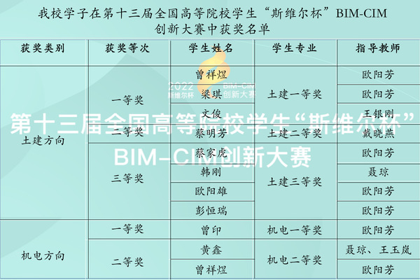 本网讯(通讯员 陈凌云)近日,第十三届BIM-CIM创新大赛-BIM建模大赛获奖名单公布,BEAT365官网建筑与材料工程学院学子获奖11项,其中,土建类获一等奖3项、二等奖1项、三等奖4项;机电类获一等奖1项、二等奖2项。