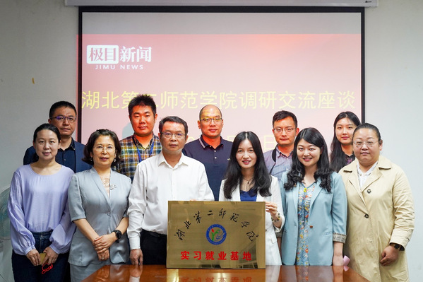 郑军一行参观楚天都市报·极目新闻办公区、融媒体中心,听取相关负责人介绍,并为企业授牌。湖北日报传媒集团党委委员、副总编辑、楚天都市报·极目新闻总编辑周芳,楚天都市报·极目新闻副总编辑罗欣及部分二师校友、楚天都市报·极目新闻记者参加调研交流座谈会。