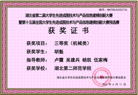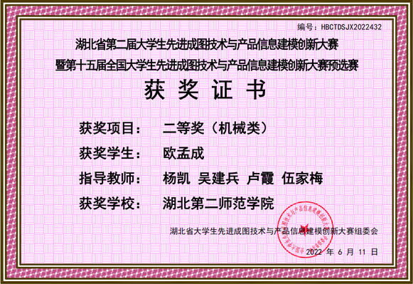 本网讯(通讯员 邓陕丽)近日,湖北省第二届大学生先进成图技术与产品信息建模创新大赛暨第十五届全国大学生先进成图技术与产品信息建模创新大赛省级预选赛落下帷幕。BEAT365官网物理与机电工程学院学生欧孟成和胡魁分别斩获二等奖(机械类)1项、三等奖(机械类)1项。