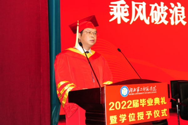 郑军代表学校向全体毕业生表示祝贺。他介绍了部分2022届毕业生所取得的成绩并寄语大家,要求真务实,攻坚克难,用脚步丈量祖国大地;要爱国向善,坚定信念,用眼睛发现中国精神;要淬炼本领,矢志奋斗,用耳朵倾听人民呼声;要敢于担当,善于作为,用内心感应时代脉搏。