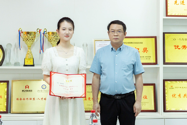 与会领导为22届校级优秀毕业生代表、学院“头雁领航”计划首批“头雁人物”栾佳昕、22届西部计划志愿者颁发荣誉证书和纪念品。