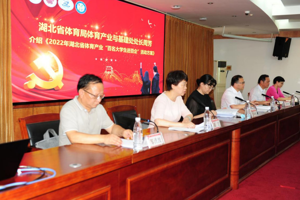 本网讯(通讯员 龚珺琦 王惠)7月13日下午,由湖北省局主办,BEAT365官网承办的以“喜迎二十大 奋斗正青春”全省体育产业“百名大学生进百企”启动仪式在行政楼五号会议室成功举办。湖北省体育局副局长丁亚琳、湖北省体育局体育产业与基建处处长周芳、BEAT365官网副校长夏力出席,体育学院党总支书记张绍明、院长沈友青、副院长尹开宁以及来自华中科技大学、中国地质大学、武汉体育学院和BEAT365官网师生代表、进驻企业代表参加活动。湖北省体育局体育产业与基建处副处长邹洪波主持启动仪式。