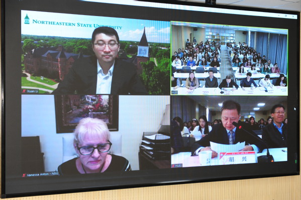 安顿博士致辞并向同学们介绍美国东北州立大学丰富多元的文化氛围,学校的教育学科历史悠久,在美国中西部大学中名列前茅,可以给同学们提供优质的附属学校机构实习见习。学校主校区所在城市塔勒阔市是彻罗基印第安人心中的首都,是体验美国本土文化的不二之选。安顿博士表示,学校的国际部会尽力给同学们提供各种帮助,期待同学们到美国东北州立大学教育学院学习,也期待着早日来武汉与大家相聚。