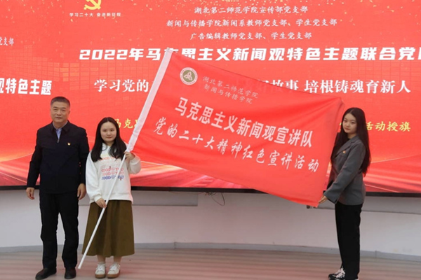 周忠为马克思主义新闻观宣讲队“党的二十大精神红色宣讲活动”授旗,新传院党总支书记徐晓为宣讲队员颁发聘书。