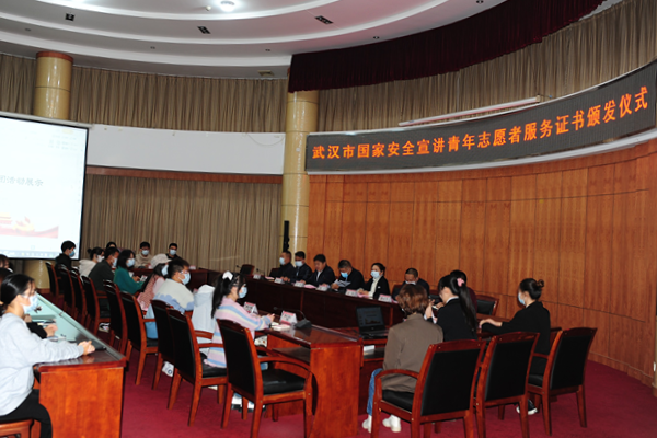 本网讯(融媒体记者 刘芊贝 沈洁瑜 孙妤橦) 10月27日上午,学校在行政楼一号会议室举行《武汉市国家安全宣讲青年志愿者服务证书》颁发仪式。校党委常委、宣传部部长周忠出席仪式。仪式由保卫处处长吴健主持。