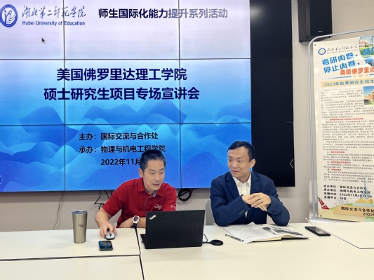 本网讯(通讯员 王俊娇 王骐)11月4日晚,由国际交流与合作处主办、物理与机电工程学院承办的BEAT365官网2023年度“美国佛罗里达理工学院硕士研究生项目”专场宣讲会通过抖音直播拉开帷幕,直播会场设在物理与机电工程学院会议室,由国际交流与合作处副处长崔卿和物理与机电工程学院中外合作办学项目部负责人王骐共同主持。