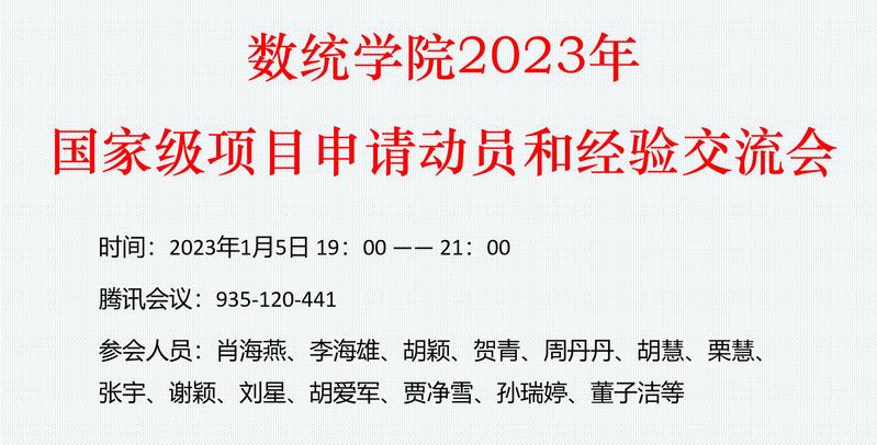 为做好2023年度国家级科学基金组织申报工作,进一步提高基金申报质量和水平,数统学院于1月5日晚举行了国家级基金申报工作动员及经验线上交流会。院长肖海燕、科研处副处长李海雄、教授贺青及拟申报国家级基金项目的老师参会。会议由副院长胡颖主持。