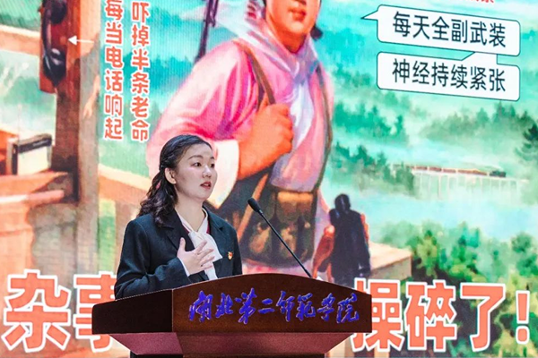 湖北省“师德先进个人”、计算机学院副院长王海军教授在课上讲述自己13年来带领学生团队参加各类比赛的心路历程,深情鼓励学生,只要有愚公移山的志气、滴水穿石的毅力,就一定能够把宏伟目标变为美好现实。“即使害怕,敢于亮剑。永不放弃,持之以恒。我为二师,团结奉献。”艺术学院“90后”辅导员骆夏君讲述师生情谊,为大家带来自己对青春的理解,鼓励青年学生要与新时代同行,勇往直前,活成自己最想成为的样子!马克思主义学院学生于欣萌则用自身经历激励青年要培育砥砺奋进的精神品格,身体力行以青春“小我”书写强国“大我”。