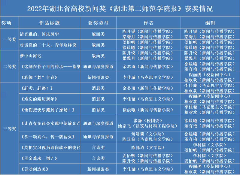 湖北省高校新闻奖是由湖北省新闻工作者协会主持评选的学术性评奖,每年评选1次。特邀全省高校相关领域专家参与评审,是全省高校年度优秀校园新闻作品最高奖。本届湖北高校新闻评选共涉及消息、通讯与深度报道、言论、新闻摄影、版面和媒体融合六大类别,省内近百所高校1000余件作品参评。在此次评选中,校报2022年第6期(总第381期)(二、三通版)《对话党的二十大,青年这样说》获版面类一等奖;校报2022年第7期(总第382期)(四版)《清音雅韵,国乐风华》获版面类一等奖。(新闻中心编辑 徐银霞)