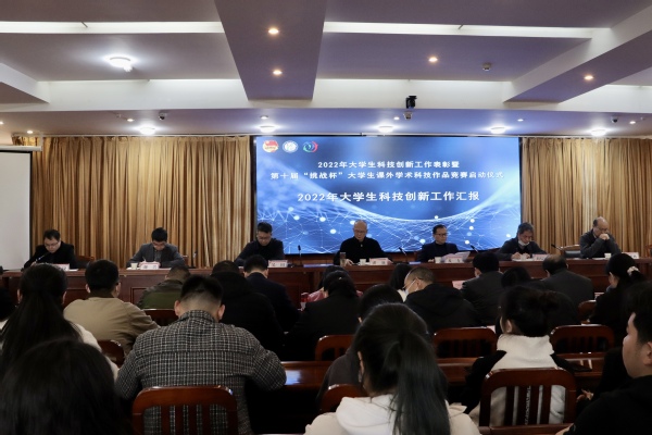 活动在观看2022年大学生科技创新工作成果展示视频中拉开序幕。校团委副书记张静作2022年大学生科技创新工作汇报并对第十届“挑战杯”大学生课外学术科技作品竞赛进行部署。参会领导为在第十届“挑战杯”大学生创业计划竞赛中受表彰的优秀团队、优秀指导老师、优秀组织单位颁奖。