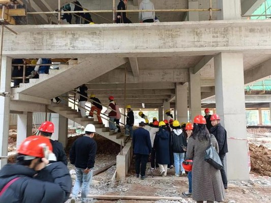 活动开始前,建材院工程管理系主任胡显燕对学生进行培训,强调进入施工现场的安全要点。随后,邢宽广带领师生进入施工大楼,逐层进行实地考察。在参观过程中,综合教学楼的区域负责人向师生介绍整栋大楼的建筑结构、砖材的种类以及楼梯的建造工艺。