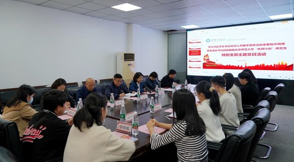 会上,全体成员观看了习近平总书记对深入开展学雷锋活动重要指示精神的视频;物机院院长李莎宣读了“优师计划”学生党支部表彰文件;物机院党委书记肖明为“优师计划”学生党支部授旗;组织部常务副部长陈慧敏向“优师计划”学生党支部赠书;“优师计划”学生党员樊艺园、入党积极分子付郧东、张超仪分别交流了学习体会。
