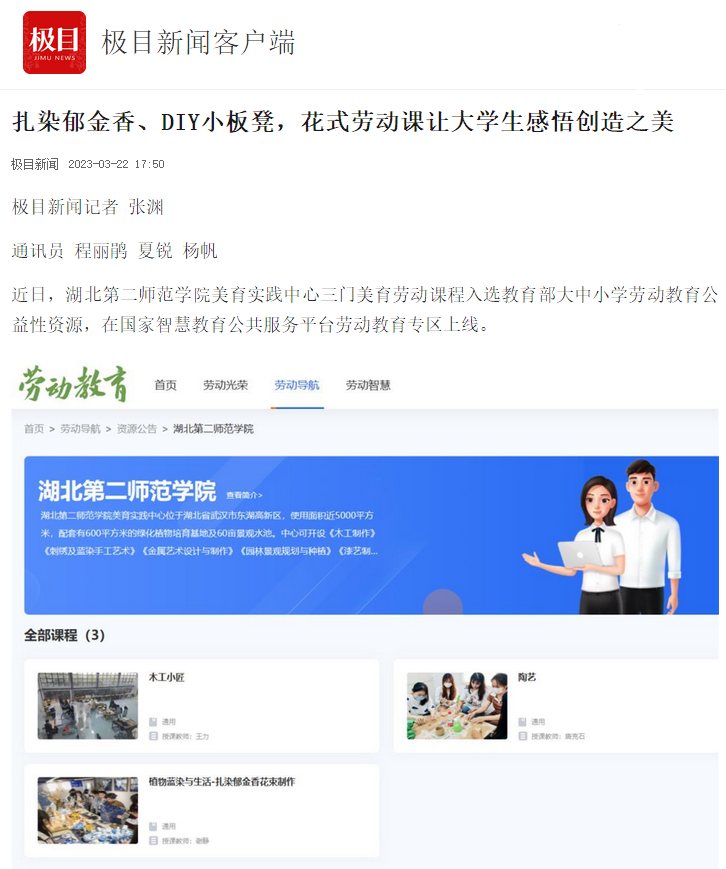 近日,BEAT365官网美育实践中心三门美育劳动课程入选教育部大中小学劳动教育公益性资源,在国家智慧教育公共服务平台劳动教育专区上线。