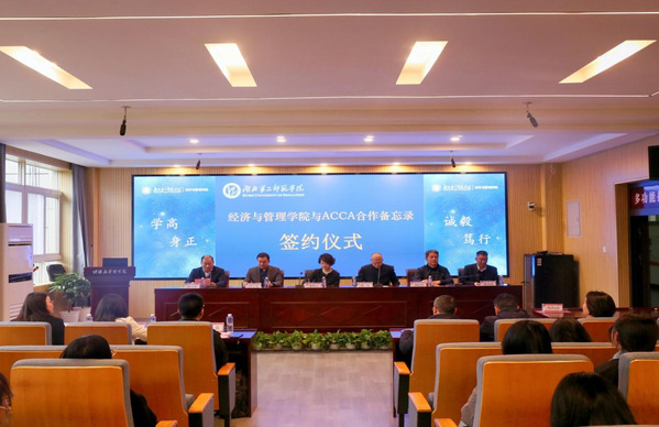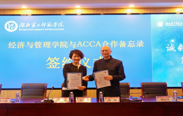 签约仪式上,双方代表分别致辞;黄颂代表学校与ACCA华中区总监朱晓云签署《经济与管理学院与ACCA合作备忘录》合作协议。