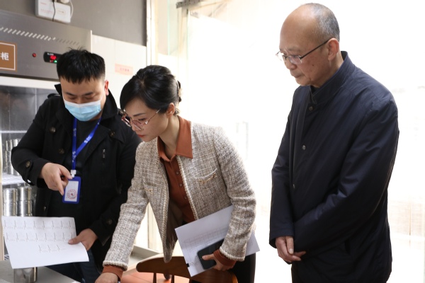 在东区食堂,肖敏一行查看了食堂安全管理体系建设、人员健康管理、食品原料采购、餐具消毒和食品留样等档案资料,实地检查了后厨操作间、仓库、食品留样间、消毒间,详细了解了伙食价格以及“互联网+明厨亮灶”建设等情况。