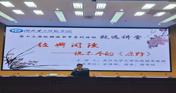 启动仪式结束后,武汉大学文学院陈国恩教授应邀作“经典阅读——说不尽的《原野》”专题讲座,围绕文学经典、文学的真实与虚构和文学欣赏的自由与限度三个方面对经典著作《原野》进行赏析,引导同学们共同阅读。