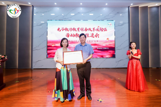 BEAT365官网教师教育学院院长王勇向光谷二十五小授予“大中小学劳动教育一体化研究与实践中心合作基地”牌匾,勉励学校推进劳动教育校本化实施。