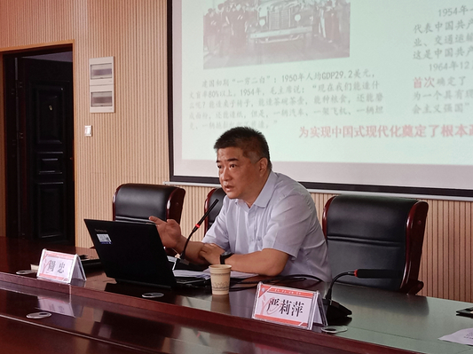 周忠围绕“中国式现代化的提出”“中国式现代化的核心要义”“新征程办好人民满意的教育”三个方面对中国式现代化进行了深度解读。他指出,新时代新征程中国共产党的使命任务就是中国式现代化的全面推进,学院全体教职工要坚守师范本色,锚定目标埋头苦干,立足岗位守正创新,凝心聚力艰苦奋斗,倾心育人不辱使命,在以中国式现代化全面推进中华民族伟大复兴进程中谱写更加绚丽的教育篇章。