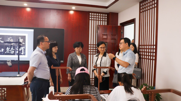 戴明一行在文学院国际中文学习平台、语文远程观摩实训室、国学吟诵室、书法室、汉语直播间等汉语文学实践训练中心“沉浸式”体验了实训项目,感受了教学氛围。随后到倍阅书店、计算机学院教师教学能力AI测评实验室等场地进行了实地考察。教务处、文学院负责同志分别对学校加强新时代语言文字工作等进行了汇报。