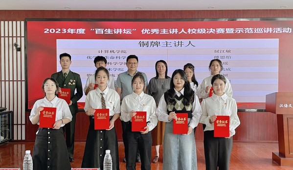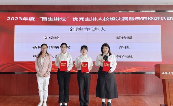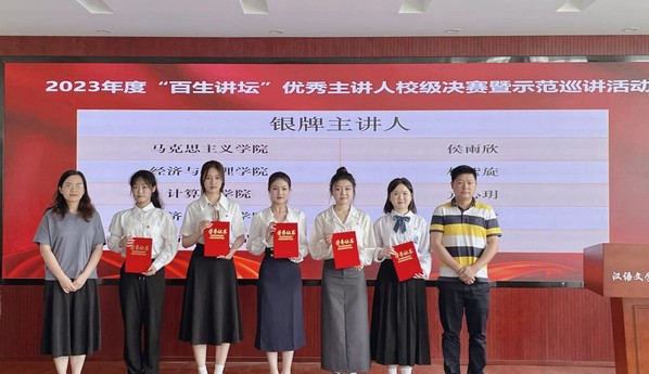 本网讯(通讯员 席中刚 黄安泽)6月7日下午,学校在文学院1301文学剧场举行2023年百生讲坛“优秀主讲人”校级决赛暨示范巡讲活动,湖北省“百生讲坛”金牌主讲人于欣萌担任主持人。