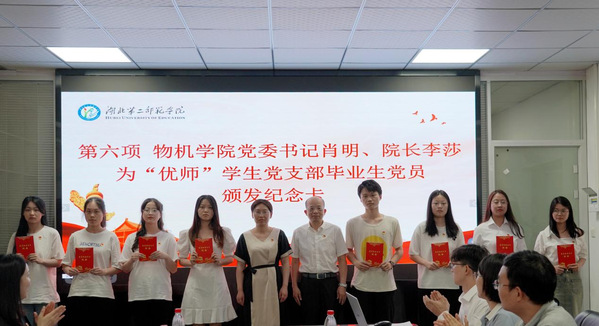 在支部主题党日环节,来小禹领学习近平总书记关于建设教育强国的重要讲话精神;“优师计划”学生党支部书记陈曦领学习近平总书记关于主题教育重要讲话精神等学习内容;组织部副部长卢郅睿为“优师计划”学生党支部新发展党员佩戴党徽;物机学院党委书记肖明、院长李莎为“优师计划”学生党支部毕业生党员颁发纪念卡。