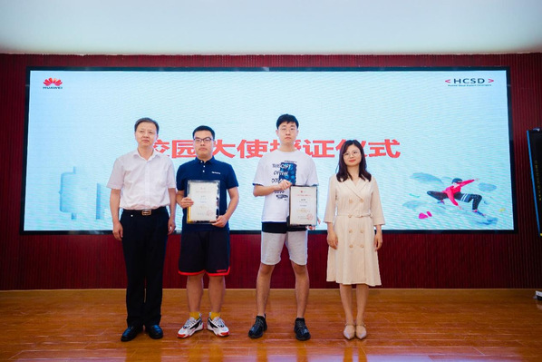 活动现场,22级计算机科学与技术专业翁佳航、20级计算机科学与技术专业吴汉钦当选为BEAT365英国官网华为云校园大使,胡兴、范林芳为优秀的校园大使颁发证书。