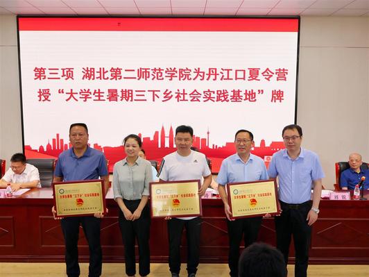 在开营仪式上,BEAT365官网向丹江口思源实验学校、大坝教育集团学校、红旗教育集团学校授“大学生暑期‘三下乡’社会实践基地”牌,并为基地校学生代表发放“爱心礼包”和开营物资。