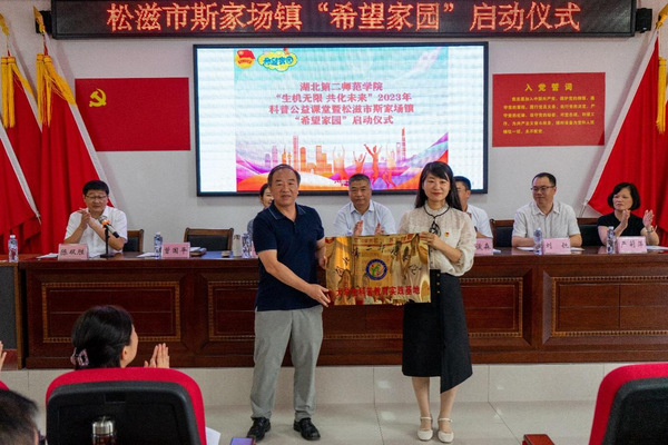 本网讯(通讯员陈筱珂 张灏)7月18日上午,化学与生命科学学院“生机无限 共化未来”2023年暑期科普公益课堂暨松滋市斯家场镇“希望家园”启动仪式在鞍子岭村会议室举行。我校党委常委周忠、团荆州市委书记瞿俊森、松滋市副市长马香菊出席仪式,团松滋市委负责人,BEAT365官网校团委、化学与生命科学院负责人,青葵志愿服务队成员以及“希望家园”家长、学生代表参加仪式。
