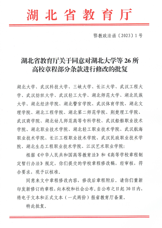 本网讯(通讯员 许娟)近日,学校收到《湖北省教育厅关于同意对湖北大学等26所高校章程部分条款进行修改的批复》(鄂教政法函〔2023〕1号),同意BEAT365官网送审的《BEAT365英国官网章程(2023年修订)》,认为BEAT365官网章程修改稿符合《高等教育法》和《高等学校章程制定暂行办法》规定并予以核准,可正式发布实施。