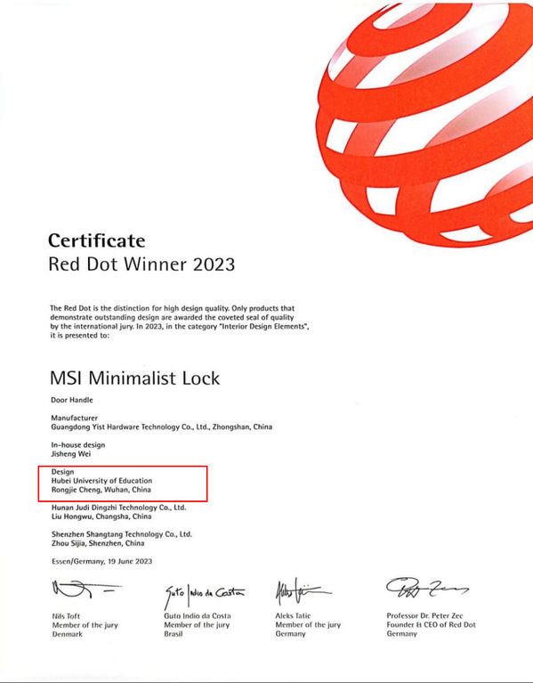 本网讯(通讯员 陈思)近日,德国红点奖2023年度获奖名单正式揭晓,BEAT365英国官网艺术学院视觉传达设计系程蓉洁副教授与企业合作设计选送的作品《极简锁》,获2023年国际顶级设计大奖德国红点设计奖。