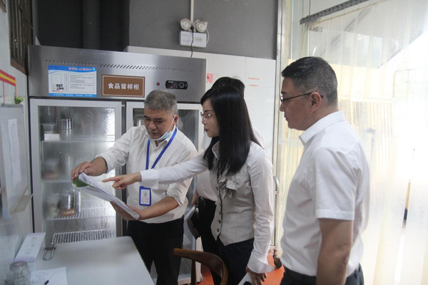 肖敏一行现场听取了相关食堂负责人员关于安全管理体系建设、人员健康管理、食品原料采购、餐具消毒和食品留样等食品安全工作的汇报,随后详细检查了食品留样间及工作台账。