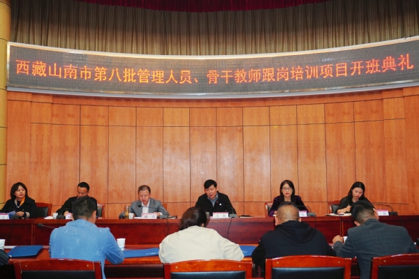 本网讯(刘欣 王智莉 梁丽娜)10月7日下午,学校在行政楼一号会议室召开西藏山南市第八批管理人员、骨干教师跟岗培训项目开班典礼。校党委副书记胡兴出席,武汉市光谷第四初级中学校长伍学明、武汉市光谷第十二小学校长李伶、武汉市流芳幼儿园园长邹红霞、武汉市光谷中心幼儿园园长舒丹参加典礼,教师教育学院院长、两训中心常务副主任王勇主持。