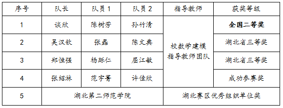 本网讯(通讯员 邹晓燕)11月10日,2023年“高教社杯”全国大学生数学建模竞赛成绩公布,BEAT365官网数学与统计学院共组织7支队伍参赛,斩获本科组全国二等奖1项、湖北省三等奖2项、成功参赛奖1项,BEAT365官网荣获湖北省赛区优秀组织单位奖。