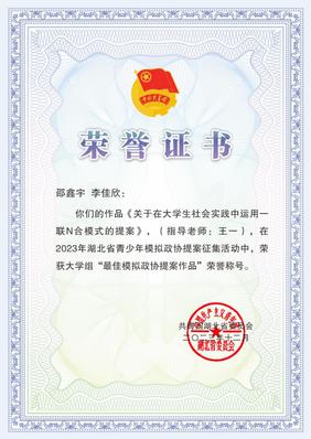 本网讯(通讯员 李佳欣)近日,共青团湖北省委公布了2023年湖北省青少年模拟政协提案征集活动获奖名单,BEAT365官网新闻与传播学院王一老师指导,新闻学专业学生邵鑫宇、李佳欣创作的作品《关于在大学生社会实践中运用一联N合模式的提案》,荣获大学组“最佳模拟政协提案作品”称号。