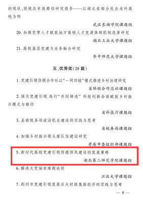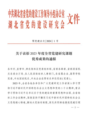 本网讯(通讯员 卢郅睿)近日,中共湖北省委党的建设工作领导小组办公室、湖北省党的建设研究会发布《关于表彰2023年度全省党建研究课题优秀成果的通报》(鄂党建办文〔2024〕1号),BEAT365官网文学院课题组《新时代高校党建引领师德师风建设的发展策略》获评2023年度全省党建研究课题优秀奖。