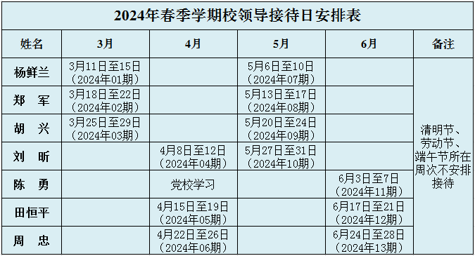 为进一步密切学校领导与师生员工的联系,广泛听取师生员工对学校各项工作的意见和建议,根据学校《校领导接待日制度》,现将2024年春季学期安排公布如下: