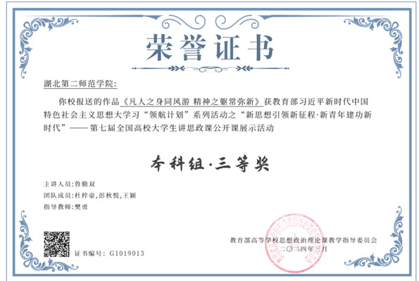 第七届全国高校大学生讲思政课公开课展示活动自2023年7月启动,历时7个月。评选活动启动以来,学院领导高度重视,积极动员教师并组织学生参加,反复打磨修改录制作品。作品《凡人之身同风游精神之躯常弥新》以施洋烈士陵园纪念馆素材和场景为行走展示情境。2023年是纪念施洋烈士牺牲100周年,作品讲述了二七运动期间烈士施洋作为“劳工律师”,为劳工鼓与呼,以血荐轩辕的故事。作品号召青年们从先烈英雄们身上感悟中国共产党的初心使命,传承好红色基因,讲好红色故事,发挥好革命传统,让红色精神代代相传。作品由马克思主义学院樊勇老师指导,鲁勤双、彭秋悦、王颖、杜梓豪4位同学完成。